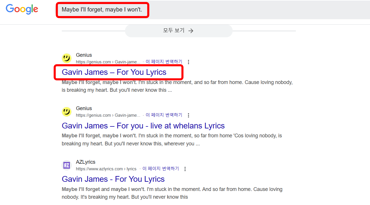 단, 가사가 굉장히 흔한 문장(예: “I love you”처럼 많이 쓰이는 구절)이라면 내가 찾는 노래 제목이 아닌 다른 노래들이 잔뜩 나올 수 있으니, 가능한 구체적인 가사 부분을 넣는 것이 좋아요. 혹시 외국어 노래라면 구글 검색을 활용해서 번역된 일부 문장을 넣어보는 것도 하나의 팁입니다.
